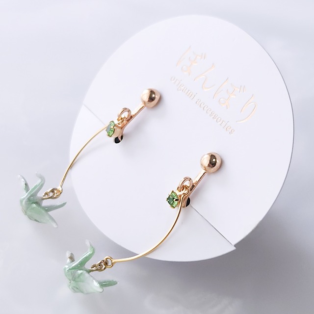 上品な緑色の折り紙を使用した 小さいながらも華やかさのある折り鶴アクセサリー。 鶴は縁起の良い鳥と言われていて 夫婦円満の象徴、天上界に通じる存在とされ また、折り鶴には 長寿祈願・幸福祈願・災害祈願・病気回復の願いが込められています。 “あなたのパートナーとなった鶴たちが たくさんの幸せな未来を運んできてくれますように…♡” そんな祈りを込めながら 一羽一羽、心を込めて折りました。 鶴はさりげなく身につけられるよう 2センチ角に小さくカットした和紙で作り上げ 女性らしい曲線が印象的なゴールドパーツと さりげなくキラッと輝くクリスタルストーンを組み合わせて 上品かつシンプルなデザインに。 着物や浴衣と合わせる他にも 気軽に和の雰囲気をまといながら花火大会や下町散歩を楽しみたい時 七五三、成人式、お正月等のおめでたいイベントの時等 使えるシーンは様々。 お守りとして 普段使いいただいている方もいらっしゃいます。 日本らしさを感じる鶴のデザインは 国内外問わずたくさんの方にご好評いただいていて 和が好き、着物をよく着る、といったお友達や 海外に住んでいるご友人へ等 贈り物としても喜ばれています。 通常ラッピングでも そのままプレゼントいただける形でお送りできますので ギフトの場合はお知らせください。 何か一言添えてお贈りしたい場合は メッセージの代筆も可能です。 折り紙部分は、強度や耐水性を高めるために レジンで何重にもコーティングを施しているため ちょっとやそっとで壊れることはほとんどありません。 コーティングされた和紙は艶がでるため 陶器のような上品で美しい仕上がりとなっています。 この小さな鶴たちが 皆さんにたくさんの笑顔を届けてくれる そんな存在となりましたら幸いです。 ✼••┈┈••✼••┈┈••✼••┈┈••✼ 【ピアス/イヤリング用金具】 ・ピアス(キャッチ付き) ポスト、チャッキ、どちらもサージカルステンレス316使用。 錆びにくく、汚れにくいのが特徴です。 ・イヤリング(ネジバネ式、シリコンカバー付き) ニッケルフリー使用。 シリコンカバー付きのため、耳の痛みが軽減されます。 【サイズ】 ・全長:約3.5㎝ ・折り鶴の羽を広げた大きさ:約1.5㎝ ・重さ:片耳約1g (1円玉1枚分くらい) 【素材】 折り紙、レジン、真鍮、クリスタルストーン 【お手入れ方法】 ◆コーティングにレジンを使用しているため、時間が経つにつれ黄色く変色していく可能性がございます。使用していない時は、紫外線の当たらない日陰での保管をおすすめいたします。 ◆紫外線や汗、水分は変色の原因となります。ご使用後は汗や汚れを細い綿棒や柔らかい布などで優しくふき取っていただくと、綺麗な状態を長く保つことができます。 ✼••┈┈••✼••┈┈••✼••┈┈••✼ ⇩ご購入の際は、こちらの注意事項を必ずお読みいただきますようお願いいたします。 https://bonbori.handcrafted.jp/p/00006 ⇩公式LINEを登録して今すぐクーポン&ポイントカードget໒꒱·゚ https://lin.ee/qDaEHAd ⇩“もしも”のためのアフターサービスのご案内♡ https://bonbori.handcrafted.jp/p/00002