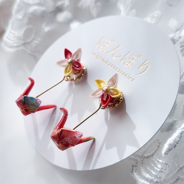 花柄の折り紙を使用した 小さいながらも華やかさのある折り鶴アクセサリー。 鶴は縁起の良い鳥と言われていて 夫婦円満の象徴、天上界に通じる存在とされ また、折り鶴には 長寿祈願・幸福祈願・災害祈願・病気回復の願いが込められています。 “あなたのパートナーとなった鶴たちが たくさんの幸せな未来を運んできてくれますように…♡” そんな祈りを込めながら 一羽一羽、心を込めて折りました。 鶴はさりげなく身につけられるよう 2センチ角に小さくカットした和紙で作り上げ 女性らしい曲線が印象的なゴールドパーツと さりげなくキラッと輝くクリスタルストーンを組み合わせて 上品かつシンプルなデザインに。 着物や浴衣と合わせる他にも 気軽に和の雰囲気をまといながら花火大会や下町散歩を楽しみたい時 七五三、成人式、お正月等のおめでたいイベントの時等 使えるシーンは様々。 お守りとして 普段使いいただいている方もいらっしゃいます。 日本らしさを感じる鶴のデザインは 国内外問わずたくさんの方にご好評いただいていて 和が好き、着物をよく着る、といったお友達や 海外に住んでいるご友人へ等 贈り物としても喜ばれています。 通常ラッピングでも そのままプレゼントいただける形でお送りできますので ギフトの場合はお知らせください。 何か一言添えてお贈りしたい場合は メッセージの代筆も可能です。 折り紙部分は、強度や耐水性を高めるために レジンで何重にもコーティングを施しているため ちょっとやそっとで壊れることはほとんどありません。 コーティングされた折り紙は艶がでるため 陶器のような上品で美しい仕上がりとなっています。 この小さな鶴たちが 皆さんにたくさんの笑顔を届けてくれる そんな存在となりましたら幸いです。 ✼••┈┈••✼••┈┈••✼••┈┈••✼ 【ピアス/イヤリング用金具】 ・ピアス(キャッチ付き) ポスト、チャッキ、どちらもサージカルステンレス316使用。 錆びにくく、汚れにくいのが特徴です。 ・イヤリング(ネジバネ式、シリコンカバー付き) ニッケルフリー使用。 シリコンカバー付きのため、耳の痛みが軽減されます。 【サイズ】 ・全長:約3.5㎝ ・折り鶴の羽を広げた大きさ:約1.5㎝ ・重さ:片耳約1g (1円玉1枚分くらい) 【素材】 折り紙、レジン、真鍮、クリスタルストーン 【お手入れ方法】 ◆コーティングにレジンを使用しているため、時間が経つにつれ黄色く変色していく可能性がございます。使用していない時は、紫外線の当たらない日陰での保管をおすすめいたします。 ◆紫外線や汗、水分は変色の原因となります。ご使用後は汗や汚れを細い綿棒や柔らかい布などで優しくふき取っていただくと、綺麗な状態を長く保つことができます。 ✼••┈┈••✼••┈┈••✼••┈┈••✼ ⇩ご購入の際は、こちらの注意事項を必ずお読みいただきますようお願いいたします。 https://bonbori.handcrafted.jp/p/00006 ⇩公式LINEを登録して今すぐクーポン&ポイントカードget໒꒱·゚ https://lin.ee/qDaEHAd ⇩“もしも”のためのアフターサービスのご案内♡ https://bonbori.handcrafted.jp/p/00002